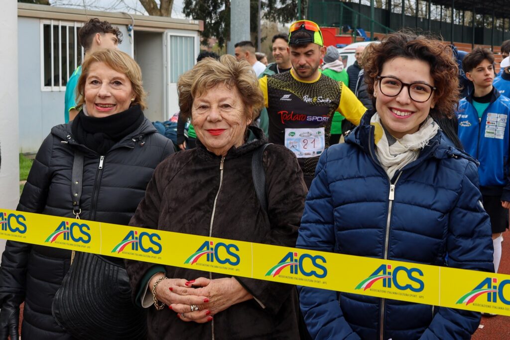 La Presidente AiCS Asti dott.ssa Patrizia Saderi (sulla destra) al nastro di partenza del Corritalia 2025.